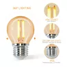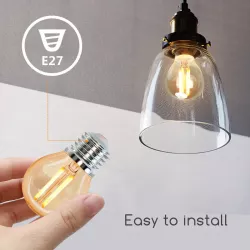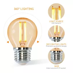 Mała kulka z złoconą bańką, stylowa dekoracja. Bursztynowa barwa światła i struktura żarnika jest świadkiem ewolucji na przestrzeni wieków. Klasyczny kształt, delikatny i piękny, przywraca wygląd, modę i elegancję żarówki, spełniając różne potrzeby estetyczne minionej epoki. Pasuje do wielu opraw o różnych kształtach i fakturze. Wysokiej jakości jasny chip LED, wykonane w technologi filament, zapewnia lepsze wrażenia wizualne.